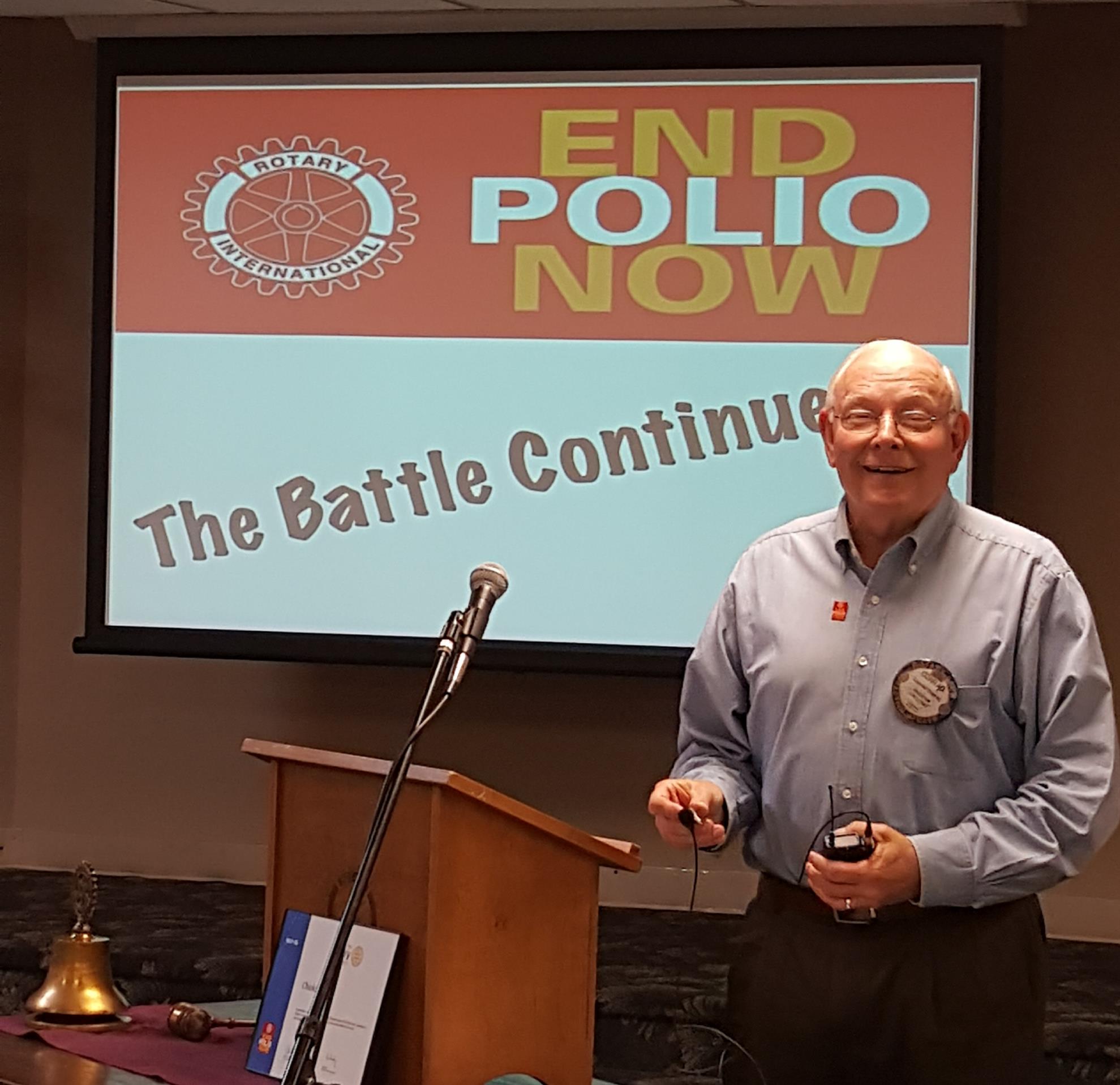 The October 25, 2018 meeting was called to order by Pres. John Gorton. The prayer was provided by Rot. Michael Oberlender and the pledge by Rot. Brett Burns. Our music leader, Rot. Mitch Williams, lead the group in the song “Through the Centuries”, which is an RI Polio song. The Rotarian of the Day was Conrad Duprez who discussed End Polio Now. Catering was provided by Billy Sims BBQ.