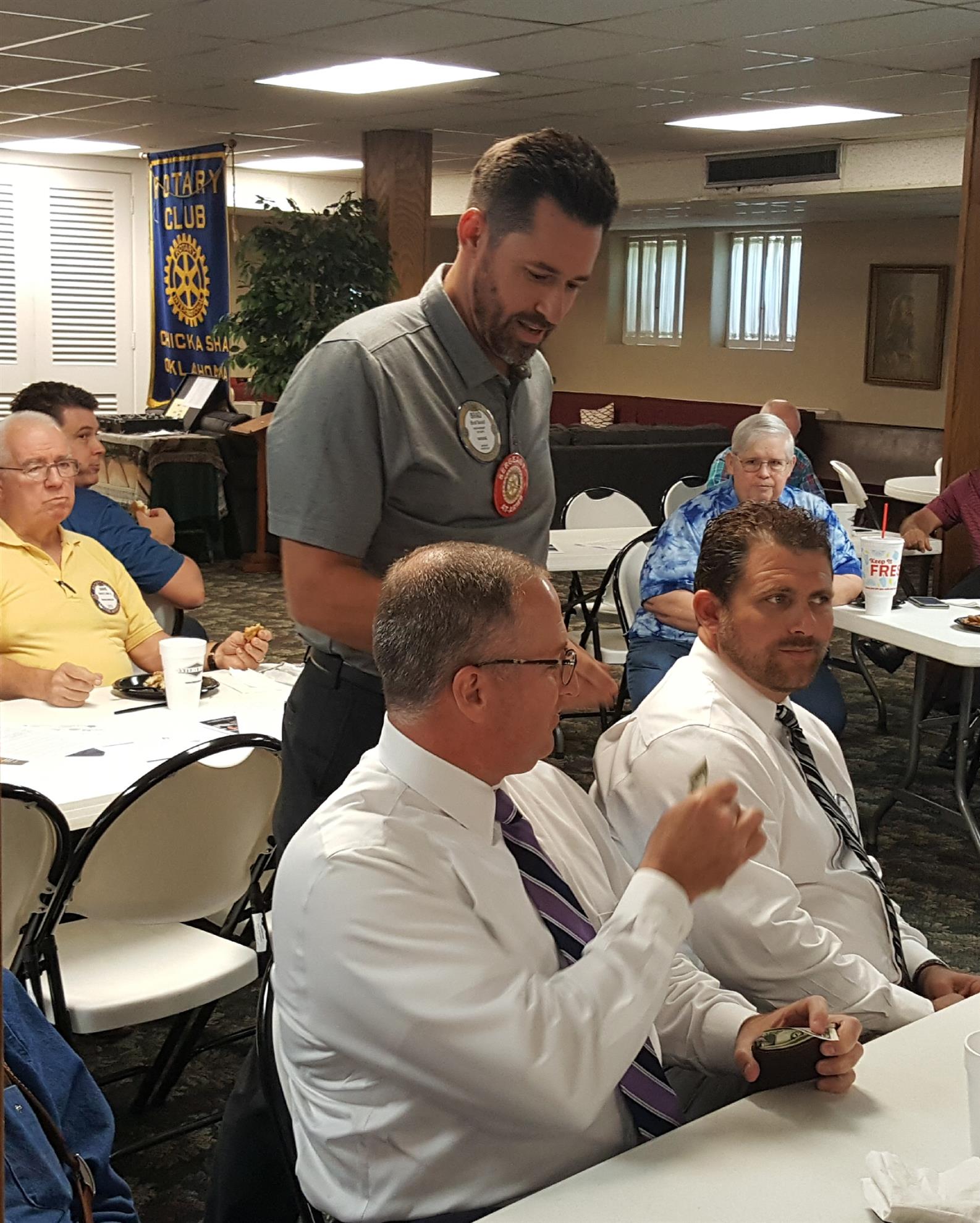 Sgt. of Arms Duvall discussing the short-pant fine with Rot. Jason Jernagin.