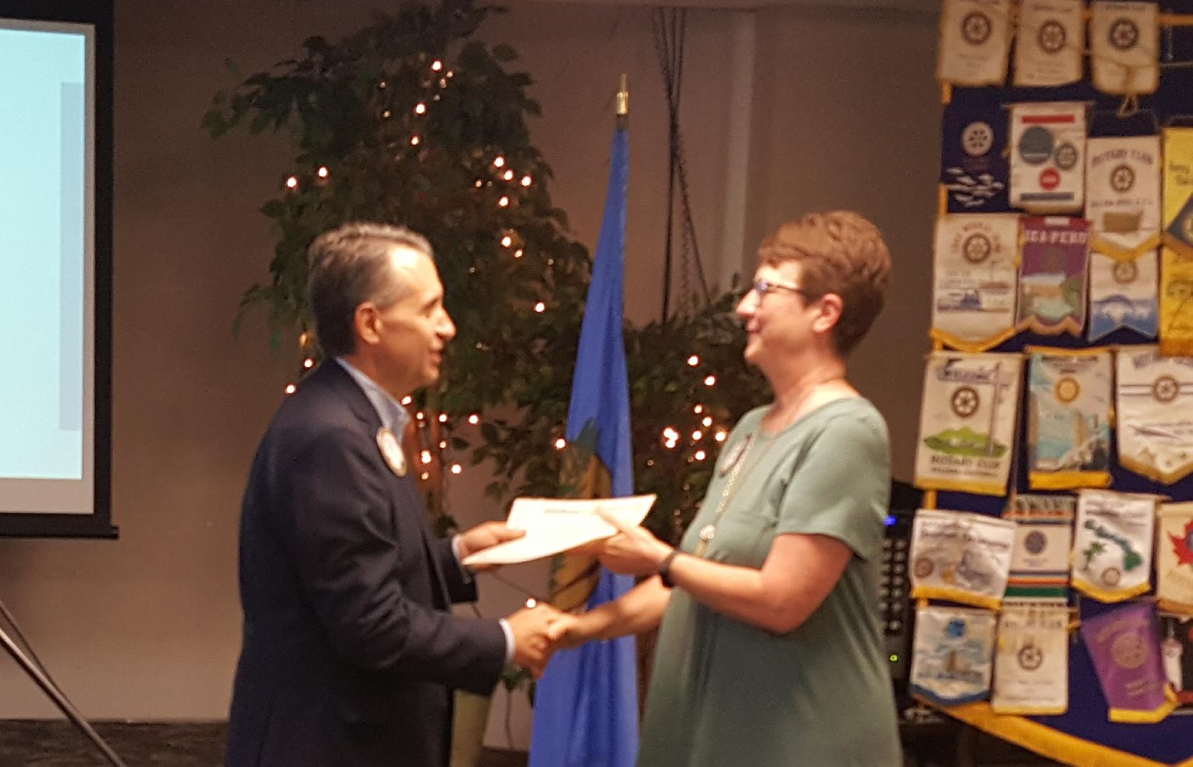 Pres. Gorton presenting award to Rot. Pauline Garrett