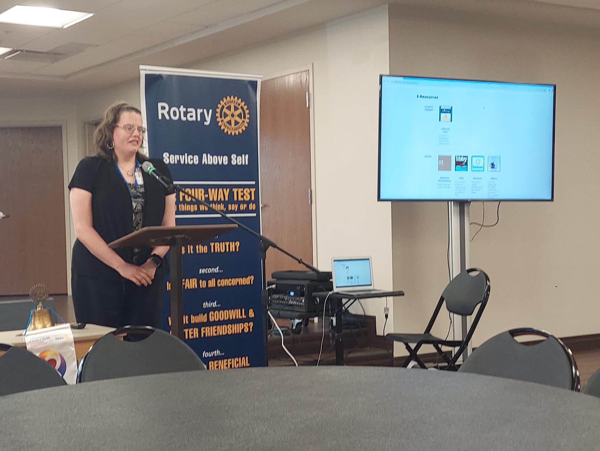 Michelle Skinner spoke about the free resources made available to the public at the Chickasha Public Library.The Rotary Club of Chickasha met April 11, 2024. Rotarian Mitch Williams led the club in singing "I Went to the Library".
