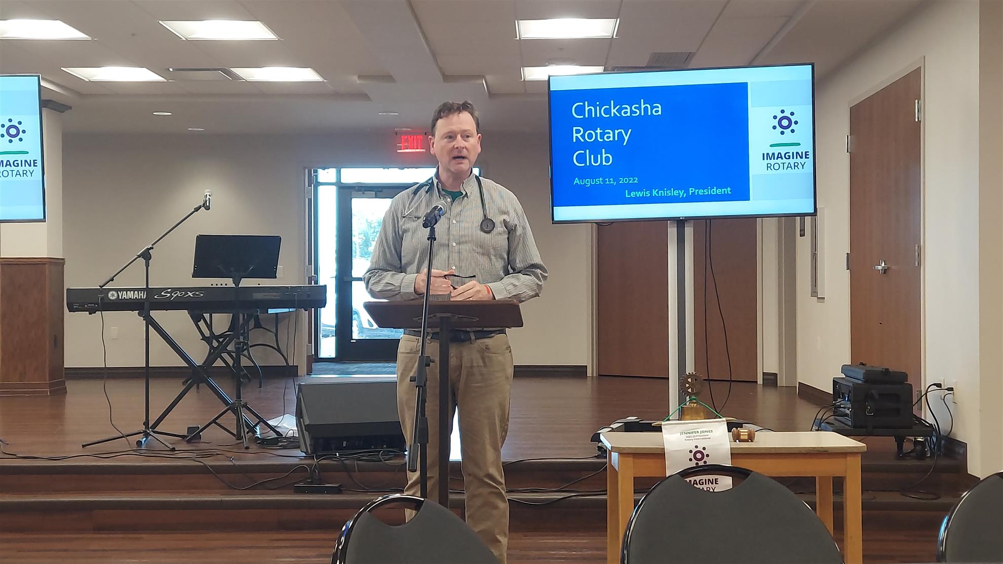 Dr. Ryan Knapp, along with other representatives of Grady Memorial Hospital, discussed the GMH Foundation and its upcoming golf tournament fundraiser. The August 11, 2022 meeting of the Rotary Club of Chickasha was called to order by President Lewis Knisley. Rot. Mitch Williams led the club in singing "The 59th Street Bridge Song (Feelin' Groovy)" by Simon and Garfunkel.