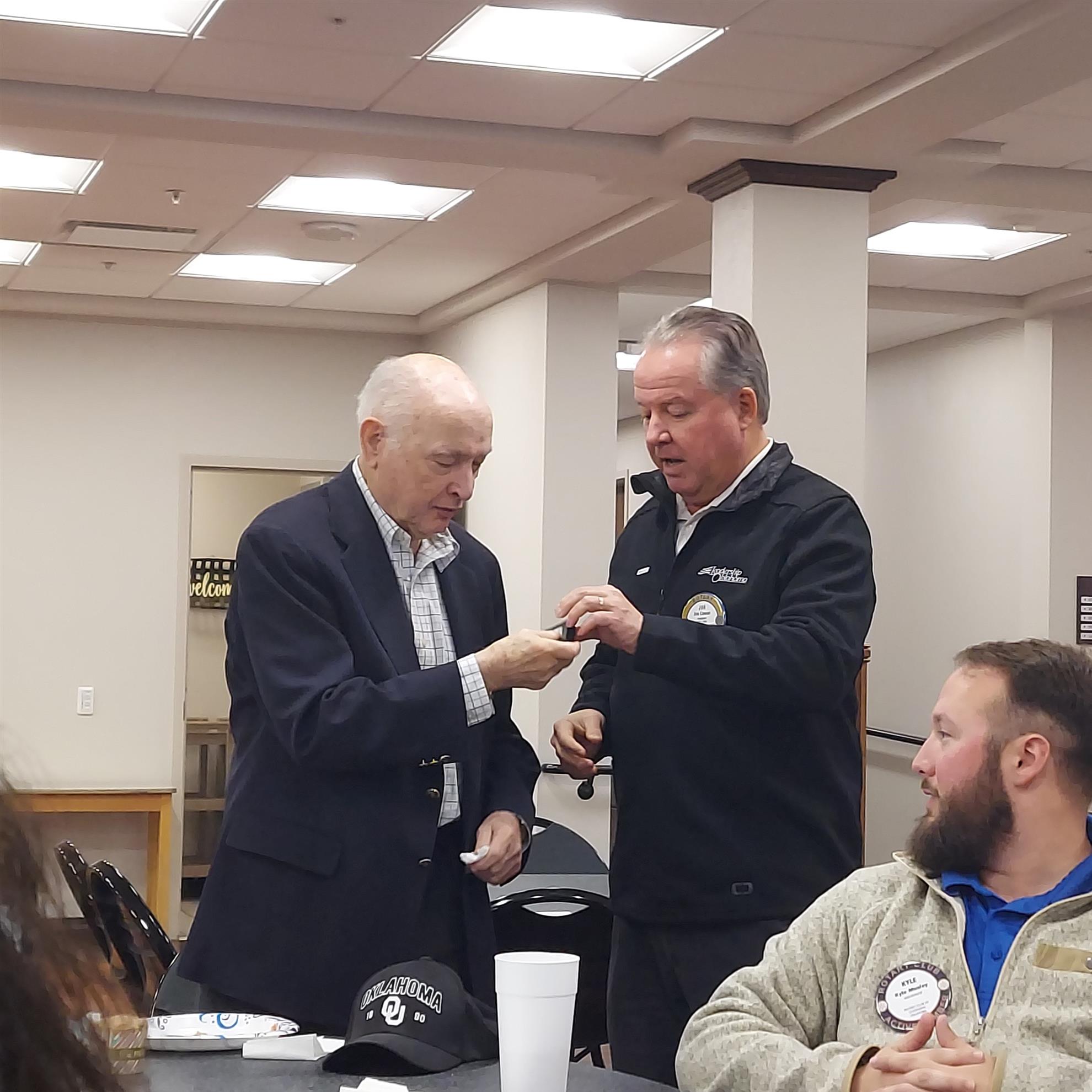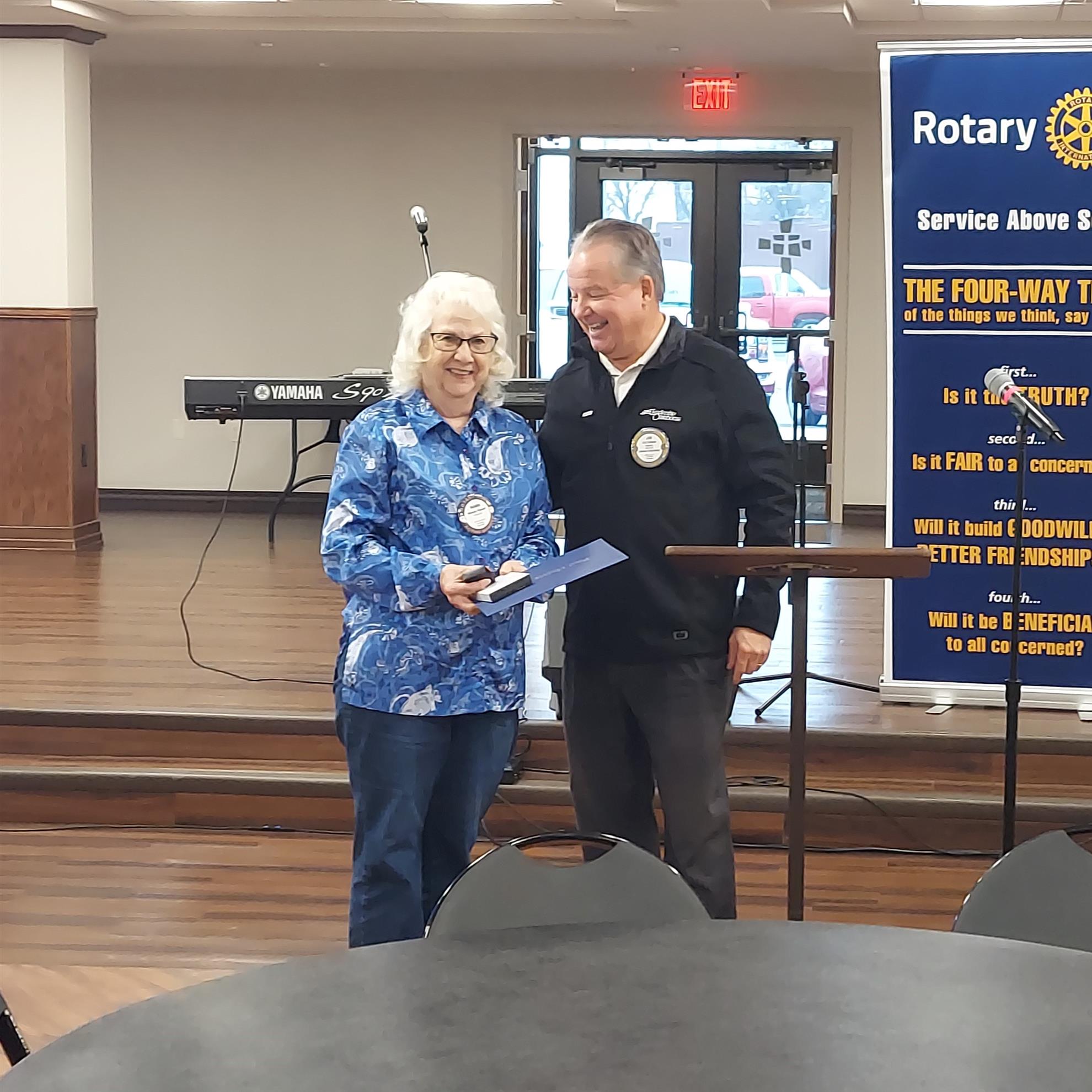 At the start of the meeting, President Jim Cowan presented Paul Harris Awards for members who could not attend the main ceremony at the Christmas Party. Wanda Powell received an honorary fellowship donated by Bill McVey. John Mosley received a multiple Paul Harris award.