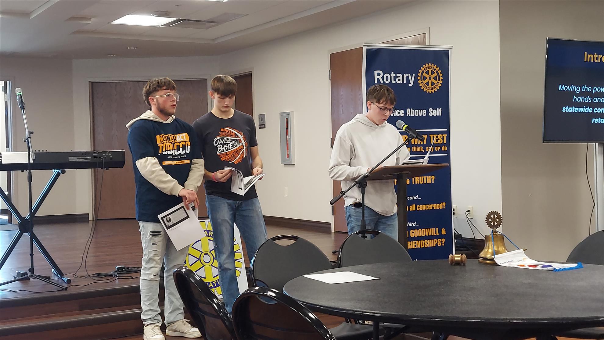 As Rotarian of the Day, Heather Roehrick introduced the program. The speakers were part of TSET's Youth Action for Healthy Leadership (YAHL) program—coordinator Aisha Ensley and Ninnekah High School students JJ Jerdee, Jacob Horn, and Eli Brake.