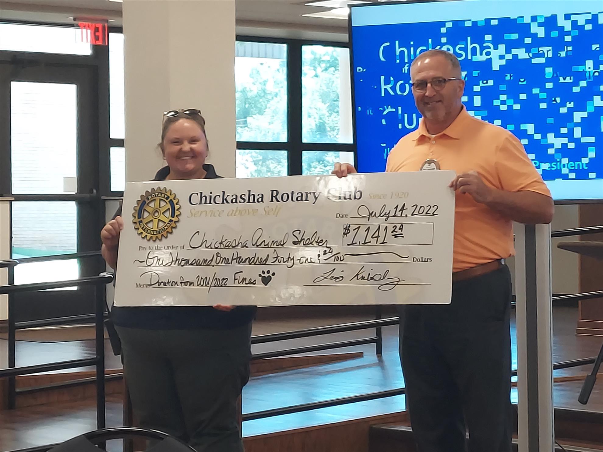 Stanton then presented Lacey Graham from the Chickasha Animal Shelter with a check for $1,141.24, raised from fines in the 2021-22 year.